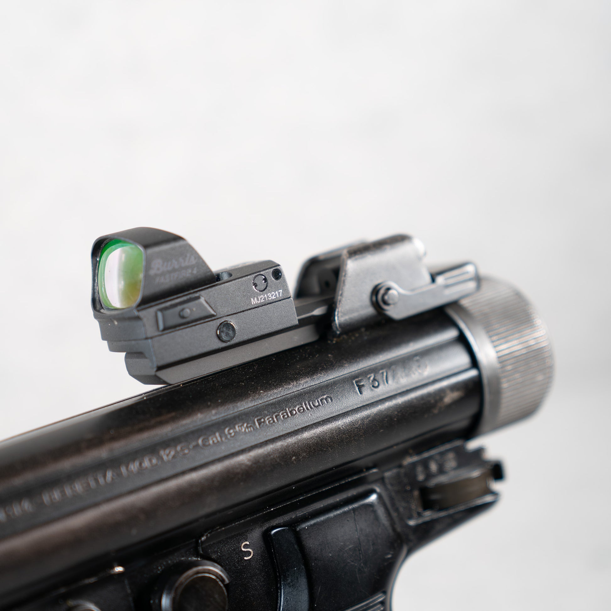 Optic Rail for the Beretta PM12. Type Rail for red dot type optics. Simply remove your iron sight and replace with this aluminum rail.