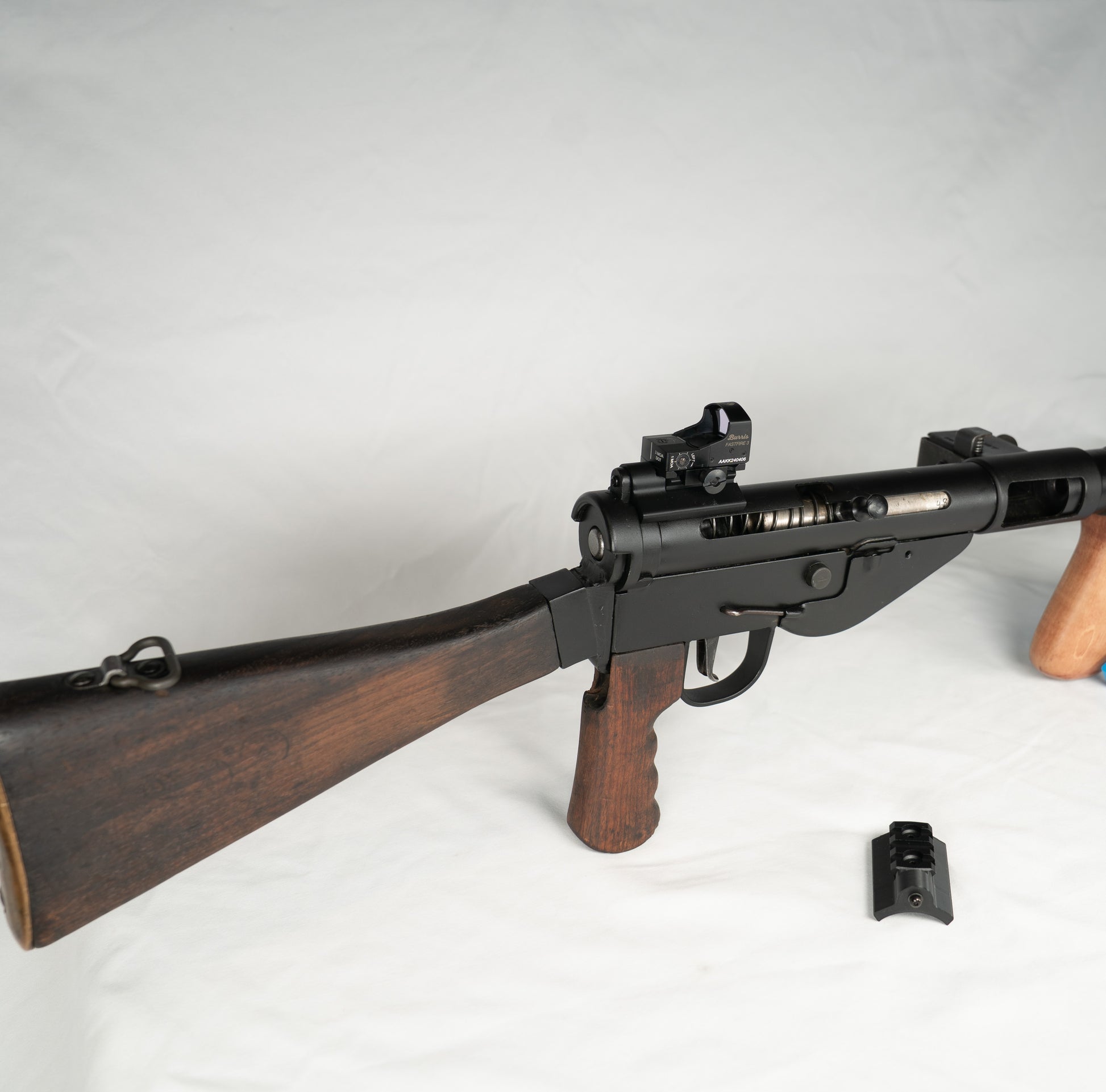 Optic mount for the Sten Submachine Gun. Easy to install. Rail is made of aluminum and the mount is made of ABS plastic. Will not require you to modify or harm your firearm. Using magnets to hold the mount in place and a screw through the rear sight hole.